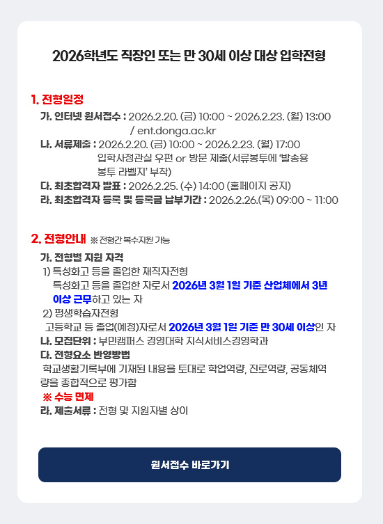 게시판 열린 미래 꿈이있는 대학, 동아대학교 메인으로 이동 게시판 학과안내 교육과정 학사/장학안내 게시판 기타 닫기 자유게시판 공지사항 자유게시판 수업게시판 닫기 게시판 게시판 공지사항 자유게시판 수업게시판 자유게시판 SNS 목록열기 FACEBOOK 공유하기 TWITTER 공유하기 BLOG 공유하기 SNS 목록닫기 인쇄 url 복사 메인비주얼 동아대학교 지식서비스경영학과지식과 경영의 조화, 성공의 열쇠를 찾다제조 및 서비스업 등 다양한 분야의 재직자 교육을 위한 교육과정을 제공하며, 산업 종사자의 기본자세 함양 및 관리자로서 갖추어야 할 지식과 소양을 함양하는데 목적을 두고 있습니다. 이전 장면 다음 장면 정지 재생 Quick Service 학사일정 교과과정 학과안내 오시는길 교수소개 이전 장면 다음 장면 새로운 소식 공지사항 더보기 장학안내 더보기 수업게시판 더보기 학과 유튜브 갤러리게시판 영역 준비중입니다.